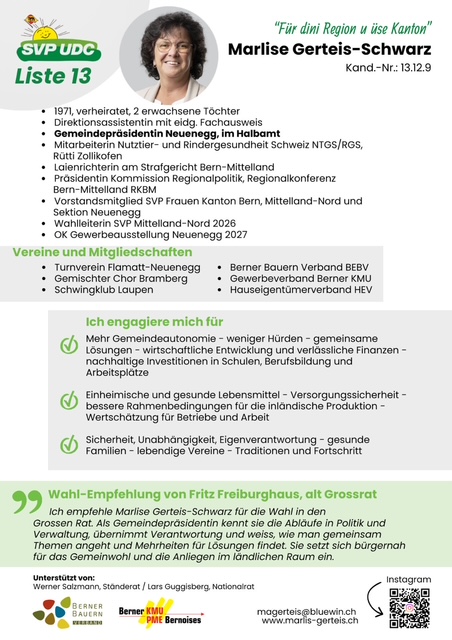 Gewählt ist Marlise Gerteis-Schwarz (bisher) mit 693 Stimmen! Vielen herzlichen Dank, ich freue mich sehr als Bestgewählte weiterhin im Gemeinderat mitwirken zu können. Mittlerweile ist auch klar, dass ich mich als Gemeindepräsidentin auch die nächsten vier Jahre (2025 - 2028) weiter für Neuenegg einsetzen darf.
